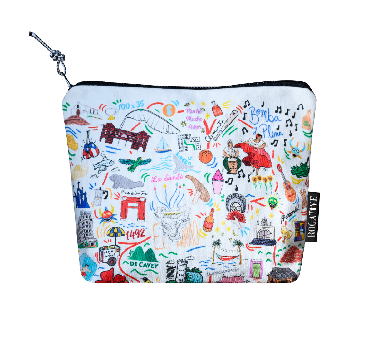 Útil bolso para guardar todas nuestras chucherias para un fin de semana especial. Collage con diseños emblemáticos de nuestra cultura puertorriqueña.
